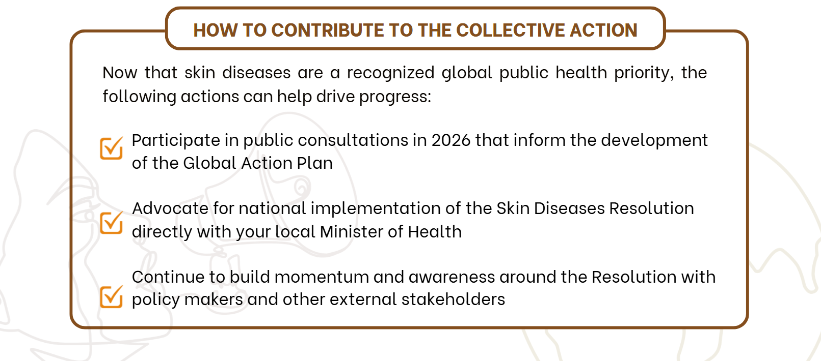 Civil society has a critical role to play in partnering, guiding and holding decision-makers accountable to ensure skin diseases are addressed as the public health priority.