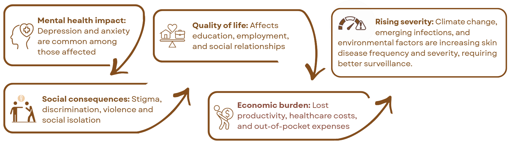 Skin diseases affect individuals of all ages and are one of the most common reasons for seeking medical help, impacting an estimated 4.69 million people globally each year. Yet, they remain disproportionately neglected in national and global health priorities. The consequences extend beyond physical suffering, with social stigma, mental health impacts, and lost productivity exacerbating inequalities, particularly in low- and middle-income countries.